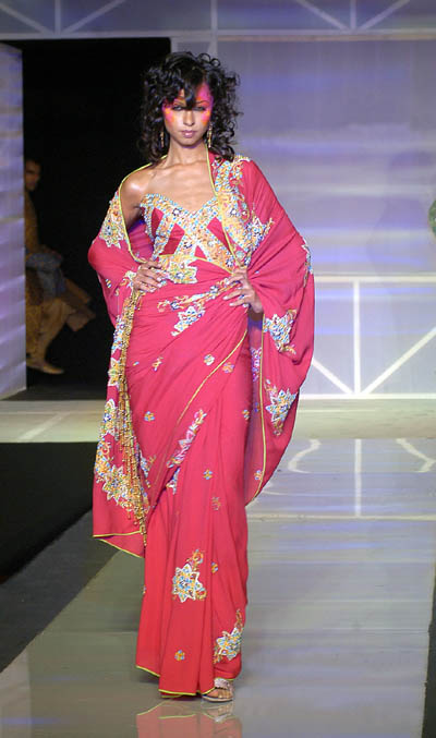 Fuschia sari with mirrors and swarovski embroidered panels.
