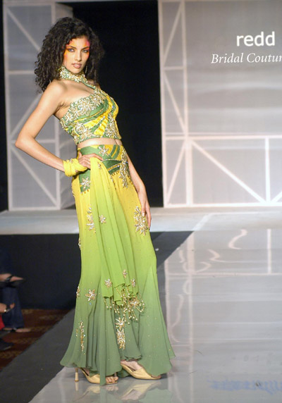 Yellow and Green SkirtStyle Number : RDD06-136High neck quilted corset with panelled bias skirt.