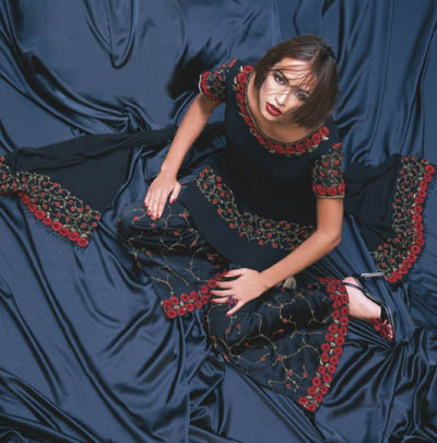 Pure Georgette Kurta Velvet Flockwork and stemwork with fully embroided and Satin Pants