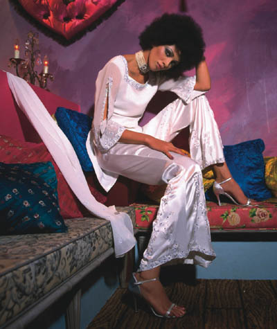 Pure Georgette Qurta with slit sleeves, pure satin pants with velvet flockwork and Swarovskis